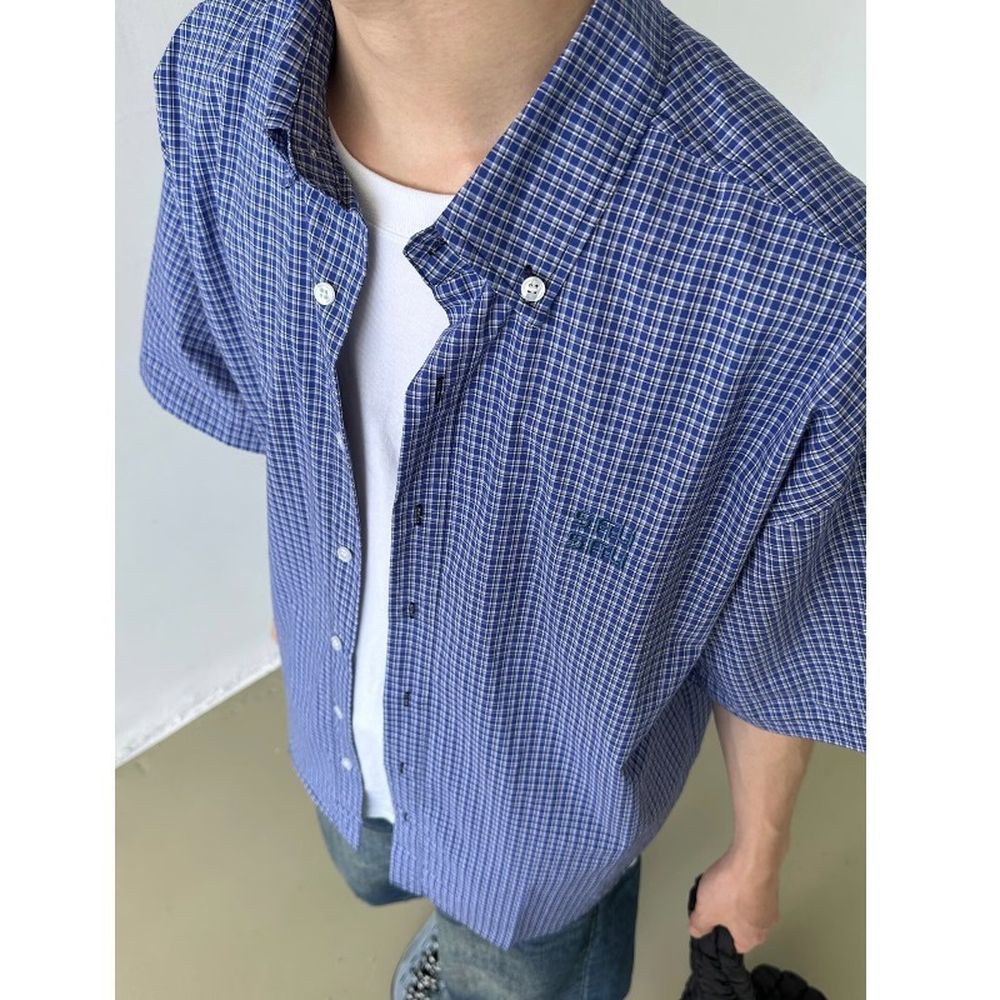Men's Blue Plaid Shirt Short-Sleeved Summer Jacket