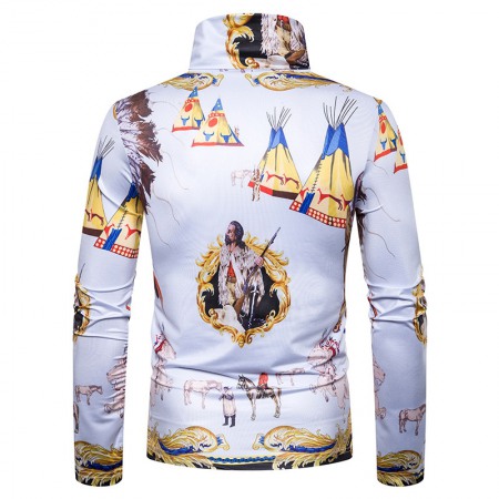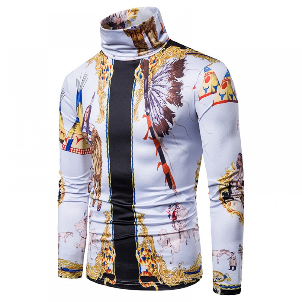 New Men's Large Size 3D Color Character Print High Neck Long Sleeve T-Shirt Bottoming Shirt